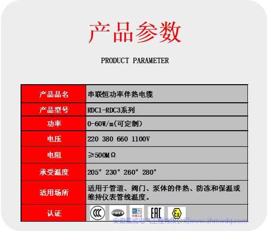 串聯恒功率電伴熱帶(RDC)產品名稱:串聯恒功率電熱帶型 號:RDC產品規格:3-7mm2溫度范圍:0-150℃耐溫溫度:205℃ 250℃標準功率:0-60W/M具體可定制常用電壓:220 3