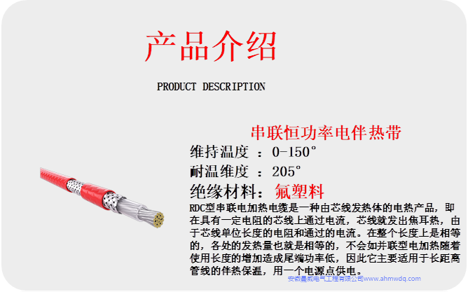 RDC型串聯電加熱電纜是一種由芯線發熱體的電熱產品,即在具有一定電阻的芯線上通過電流,芯線就發出焦耳熱,由于芯線單位長度的電阻和通過的電流。在整個長度上是相等的,各處的發熱量也就是相等的,不會如并聯型電加熱隨著使用長度的增加造成尾端功率低,因此它主要適用于長距離管線的伴熱保溫,用一個電源點供電。