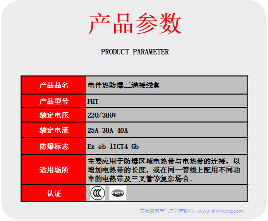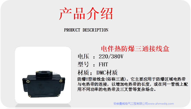 防爆三通接線盒(俗稱T型接線盒)。它主要應(yīng)用于防爆區(qū)域電熱帶與電熱帶的連接,以增加電熱帶的長(zhǎng)度,或在同一管線上配用不同功率的電熱帶及三叉管等復(fù)雜場(chǎng)合,其外殼為DMC塑料制成。
