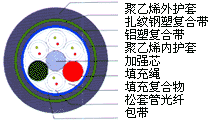 產品型號: GYSTA53也叫(GYTA53) 光纖松套管 金屬中芯加強件 纜芯填充油膏 雙涂料鋁帶粘結PE內護套  軋紋鋼帶粘結PE外護套